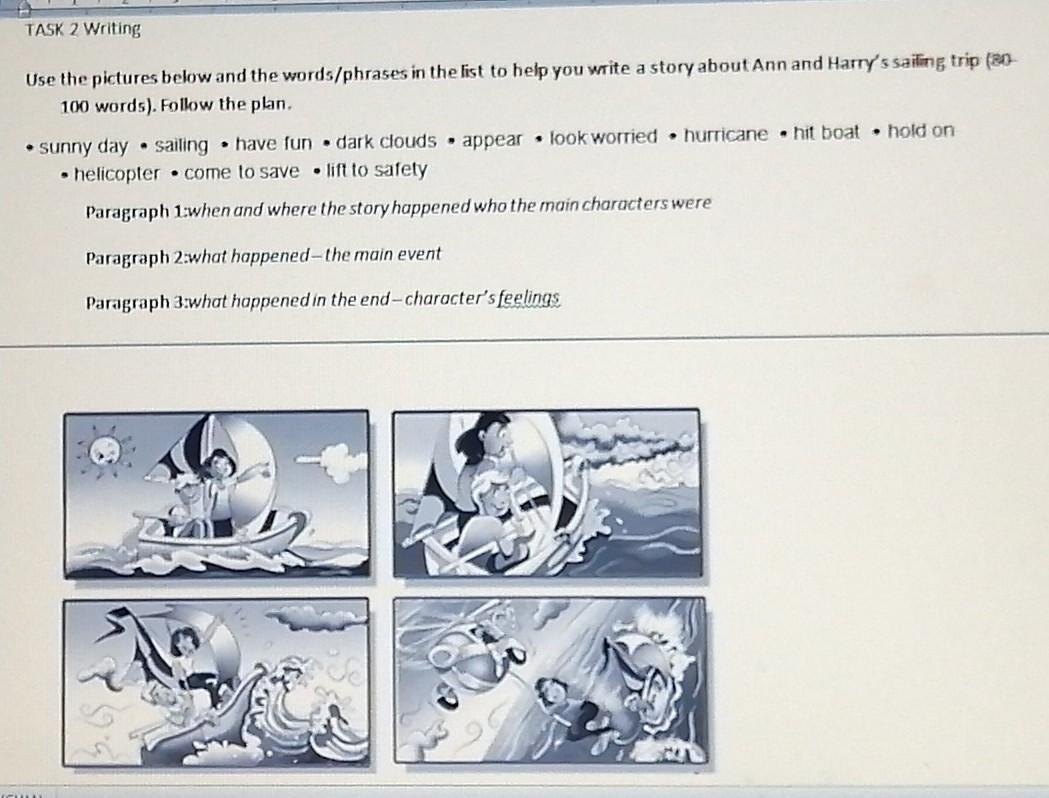 ANN AND HARRY DECIDED TO GO SAILING ON SUCH A SUNNY DAY FOR FUN, BUT THEY DID SOME EXERCISES BEFORE CLASS. THEY BEGAN TO STUDY AND SUDDENLY DARK CLOUDS COVERED THE SKY AND THE SUN. THEY LOOK UNMOVED. THE HURRICANE HAS STARTED, BIG WAVES ARE KNOCKING DOWN THE BOAT, IT'S GOOD THAT THEY CALLED A HELICOPTER, HOLD ON! FINALLY, THE HELICOPTER FLEW IN TO SAVE THEM AND FLY TO A SAFE PLACE. THEY WERE VERY SCARED BUT THANKS TO THE RESCUERS, IF NOT FOR THEM THEN ANN AND HARRY WOULD HAVE DROWNED.