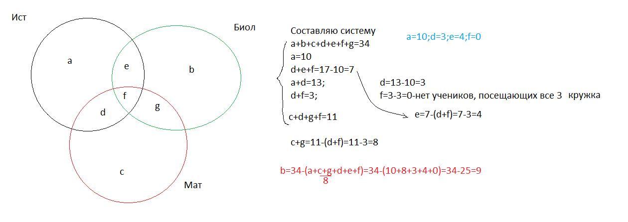 В классе 34 ученика. Каждый их них посещает хотя бы один кружок. 17 учеников посещают исторический кружок, из них 10 – только его. 13 учеников посещают исторический кружок, но не посещают биологический. 3 ученика посещают математический и исторический кружки одновременно, 4 ученика – и биологический, и математический. 11 учащихся занимаются в математическом кружке. Сколько человек занимается только в биологическом кружке?