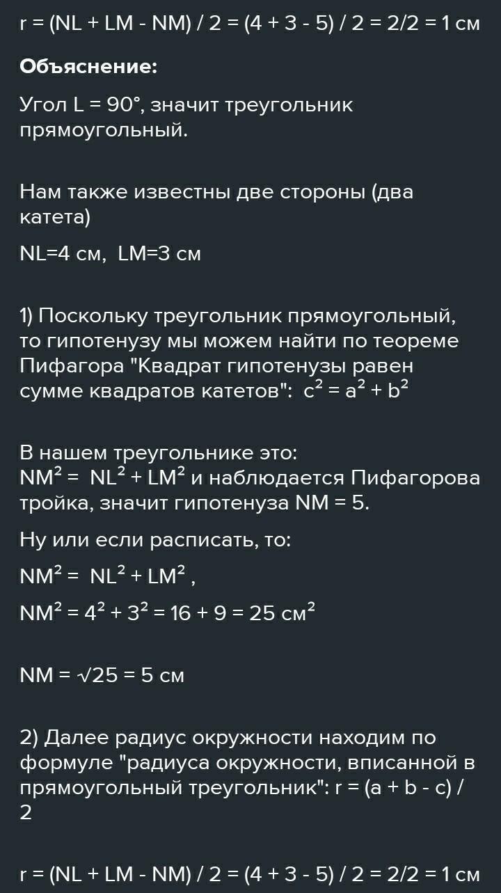 4. [6] В треугольнике INM. 21-90°, NL-4, LM-3. Найдите радиус вписанной