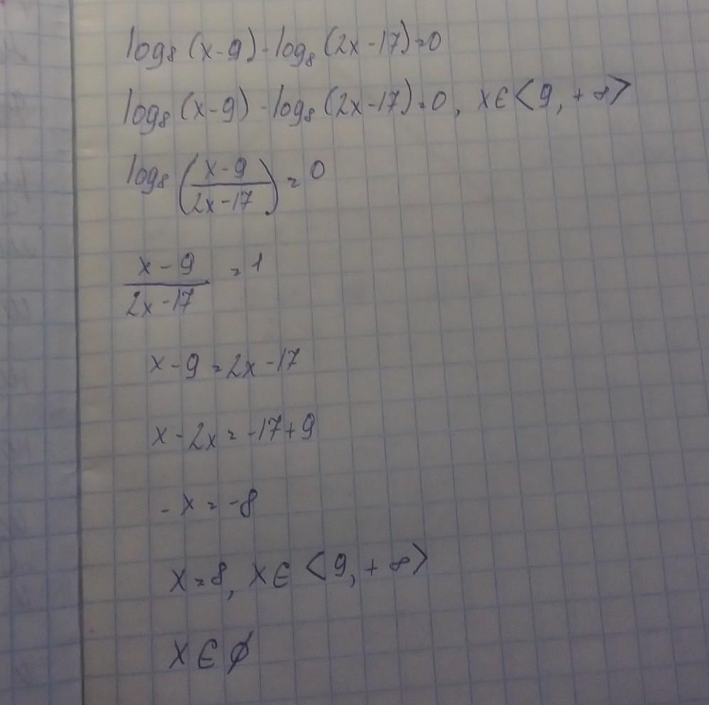 log₈(x - 9) - log₈(2x - 17) = 0