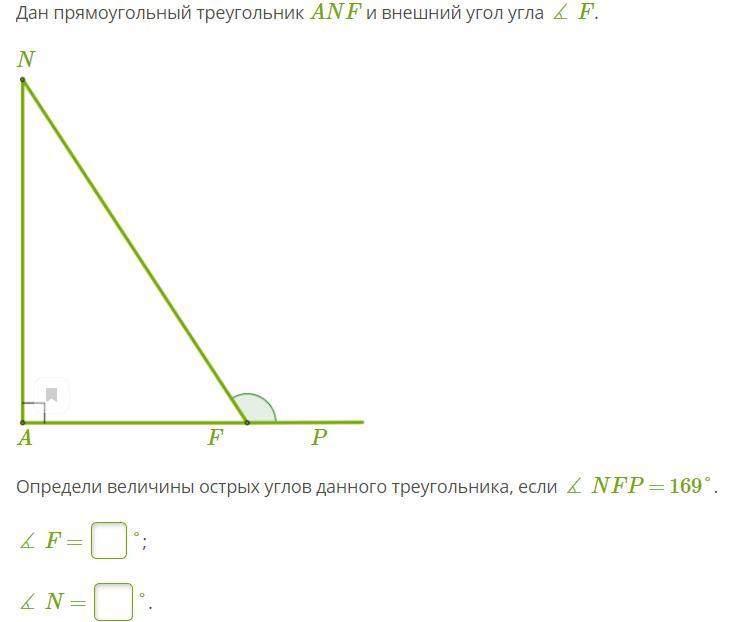Так как треугольник ANF прямоугольный то угол А=90°. Так как внешний угол 169°,то внутренний угол 11°.Ели сложить два угла то получится 101°. Так как сумма внутренних углов треугольника 180°. То угол N-180°-101°= 79°. Ответ:угол F=11°. и угол N=79°