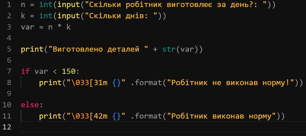 Створити програму Пайтон для обчислення продуктивності праці робітник виготовляє n деталей за один день скільки він виготовити деталей за k днів. Якщо відповідь менша за 150 то вивести повідомлення"Робітник не виконав норму" червоного кольору 100x100.Інакше "Робітник виконав норму" зелене вікно.