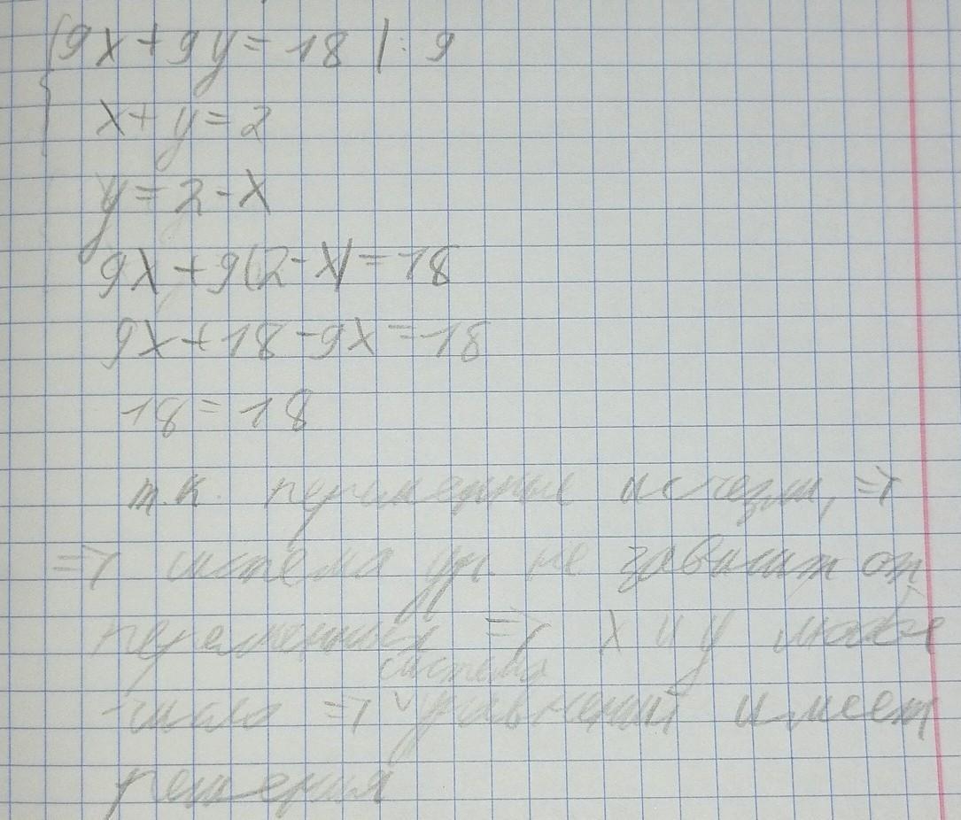 {9x+9y=18 {9(2-y)+9y=18 {18-9y+9y=18 { 0=0