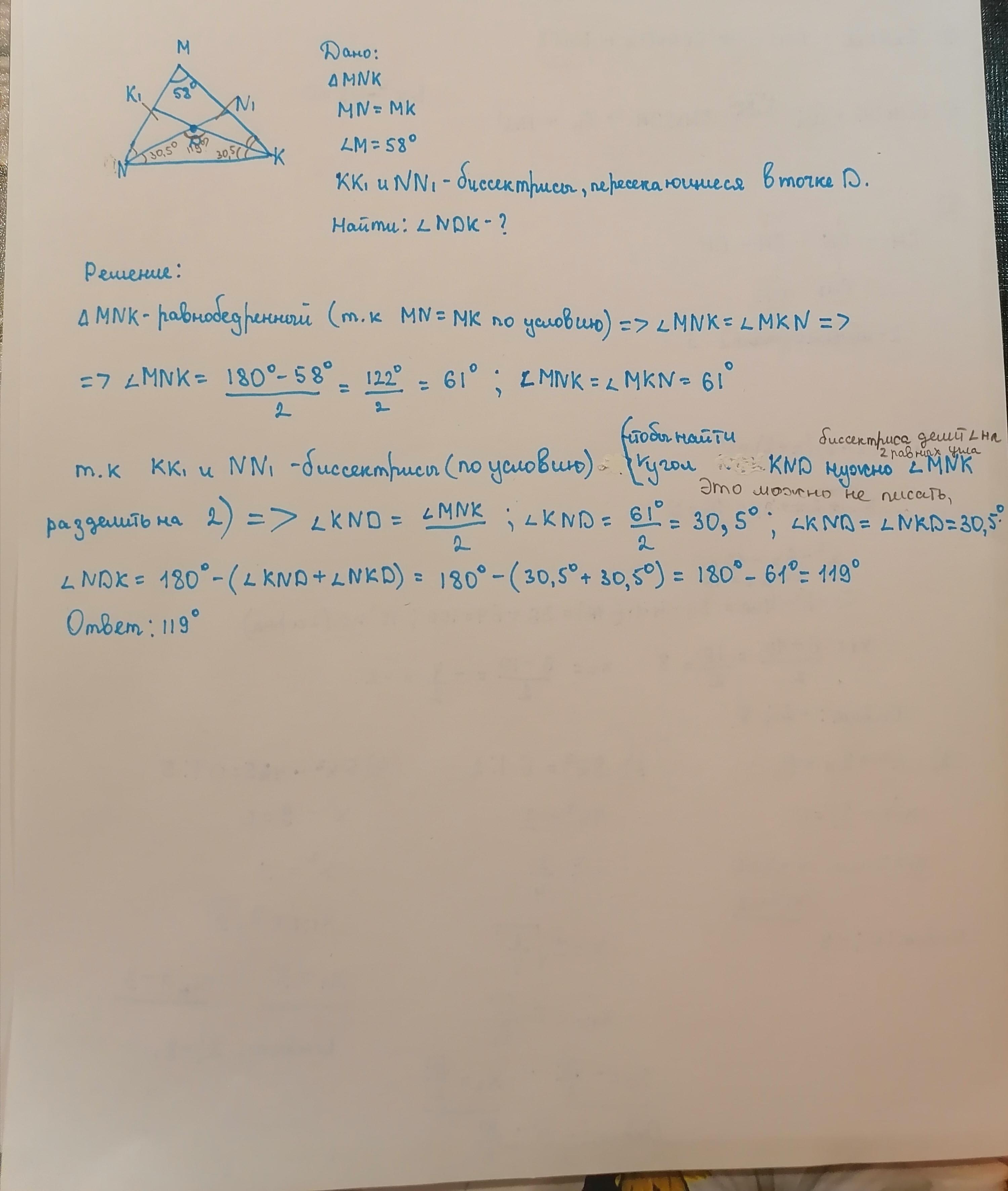 В треугольники MNK стороны MN и MK равны, угол M равен 58°. Биссектрисы углов N и K пересекаются а точки D. Найдите величину угла NDK. ДАЮ МАКСИМОЛЬНЫЙ БАЛ