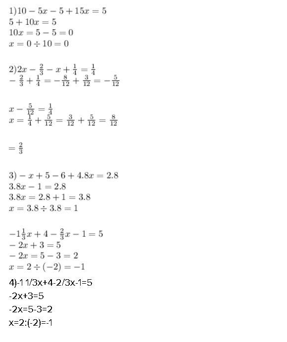 1) 2,5(4-2х)-5(1-3х)=5; 2)⅔(3х-1)-⅑(9х-2¼)=¼ 3)-(х-5)-1,2(5-4х)=2,8; 4) -1⅓(х-3)-⅔(х+1,5)=5 решите пожалуйста