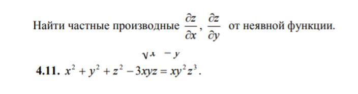 Введём функцию F(x,y,z)=x²+y²+z²-3*x*y*z-x*y²*z³=0. Тогда z'x=-F'x/F'z и z'y=-F'y/F'z. Но F'x=2*x-3*y*z-y²*z³, F'y=2*y-3*x*z-2*x*y*z³, F'z=2*z-3*x*y-3*x*y²*z². Отсюда z'x=(2*x-3*y*z-y²)/(3*x*y+3*x*y²*z²), z'y=(2*y-3*x*z-2*x*y*z³)/(3*x*y+3*x*y²*z²).