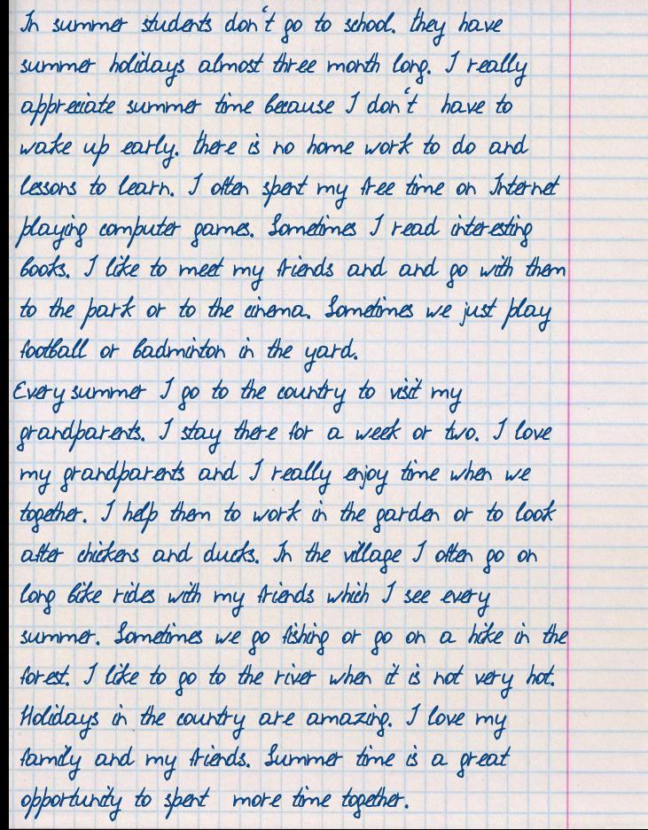 Каждое лето я еду в деревне к бабушке и дедушке. Я остаюсь там на неделю или две. Я люблю бабушку и дедушку и я наслаждаюсь временем, которое мы проводим вместе. Я помогаю им работать в саду или присматривать за цыплятами и утятами. Я часто долго катаюсь на велосипеде с друзьями, которых я вижу каждое лето. Иногда мы ходим на рыбалку либо гуляем по лесу. Мне нравится ходить на реку если не сильно жарко. Летние каникулы удивительные. Я люблю свою семью и друзей. Летнее время — это потрясающая возможность провести вместе больше времени.