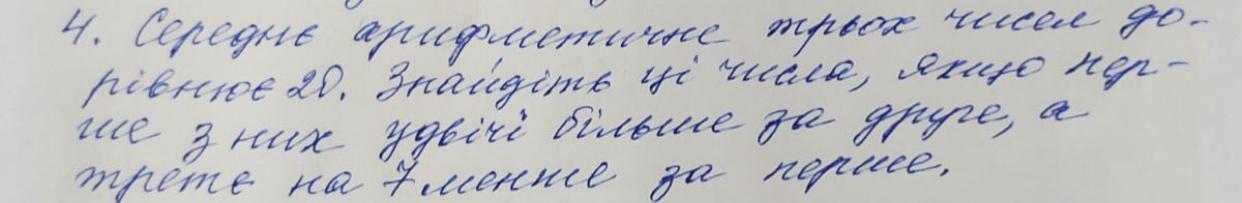Нехай друге число дорівнює х. Тоді перше дорівнює 2х, а третє 2х-7.
