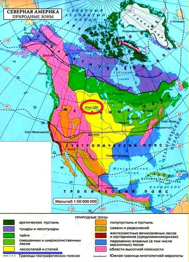 Если посмотрим на карту, данную в приложении, то увидим, что река Миссури протекает по природной зоне лесостепей и степей.