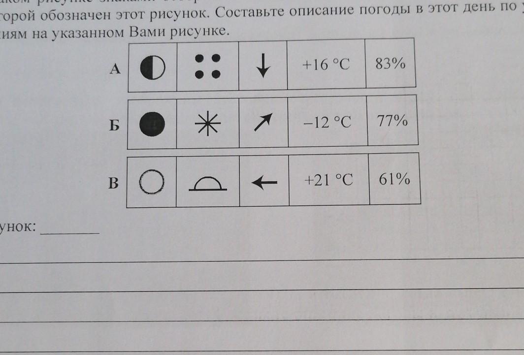 на каком рисунке знаками отображена погода в тот день когда выпал снег? укажите букву которой обозначен этот рисунок. Сосьавьте описание погоды в этот день по условным обозначениям на указанном вами рисунке
