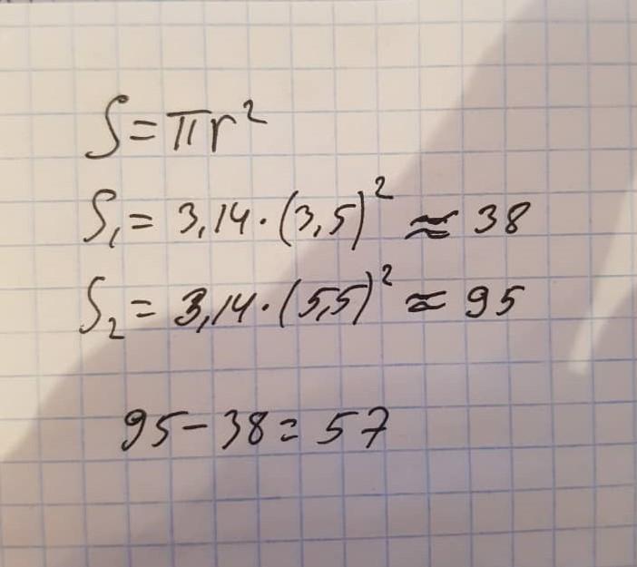 На сколько площадь круга радиуса 3,5 меньше площади круга радиуса 5,5