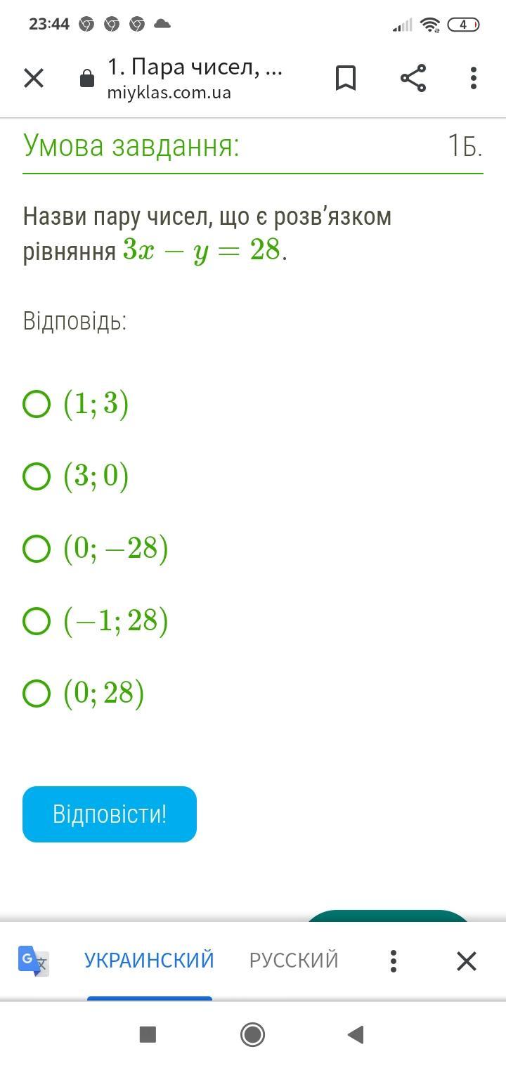 Назви пару чисел, що є розв’язком рівняння 3x−y=28.