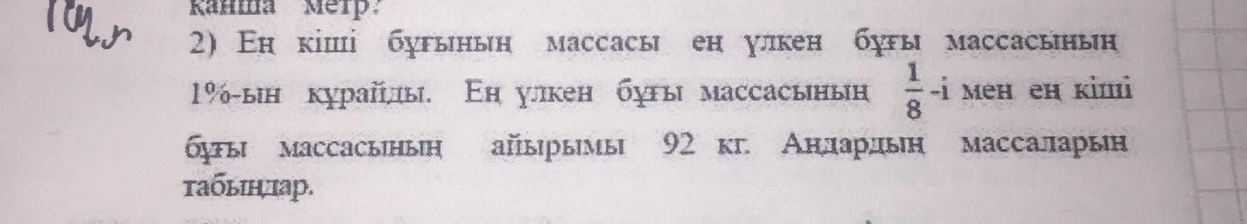 Пожалуйста помогите 1301 .2)Ен киши бугынын массасы ен улкен бугы массасынын 1% ын курайды.Ен улкен бугы массасынын 1/8 мен ен киши бугы массасынын айырымы 92 кг.Андр