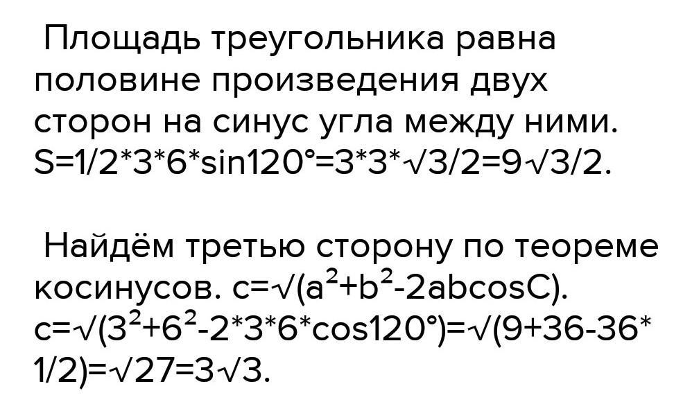 Две стороны треугольника равны 3 и 5, а угол между ними равен 120°. Найдите третью сторону треугольника и его площадь.