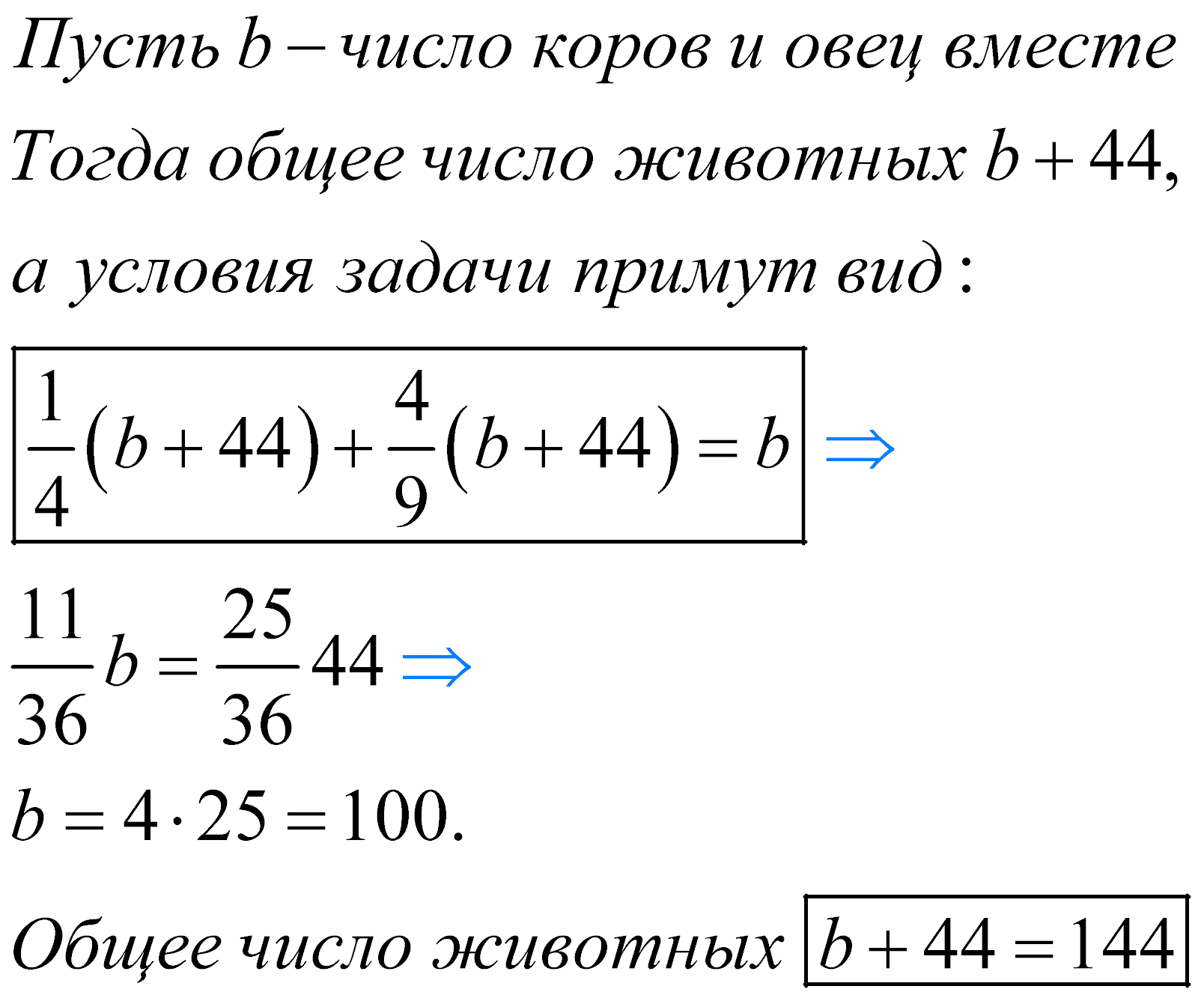 Задача. Коровы в стаде составляют 1/4 всех животных, овцы- 4/9, а коз- 44. Сколько всего животных в стаде?