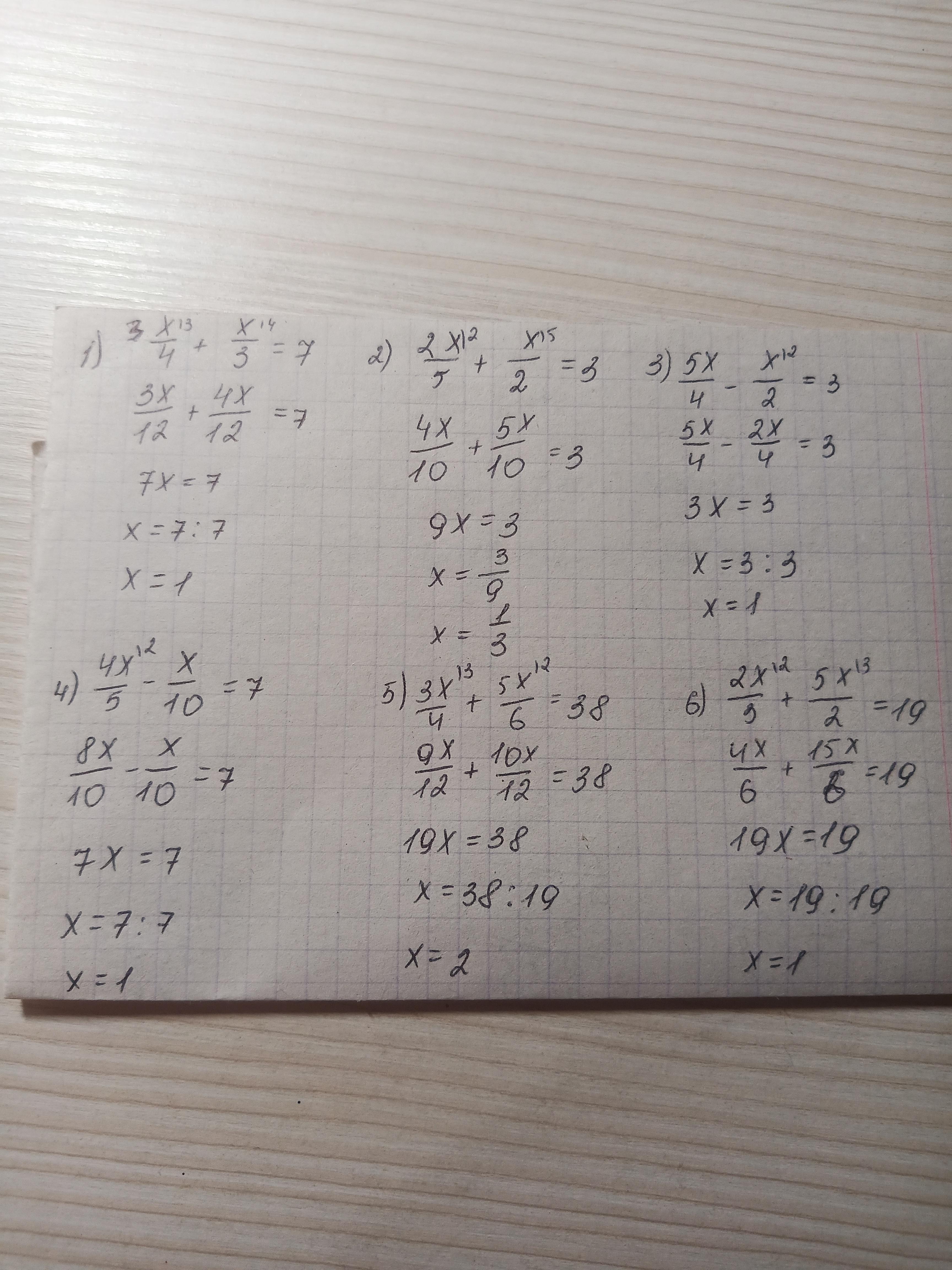 алгебра 7 класс номер 6.45. Реши уравнение: 1) х/4+ х/3=7 2) 2х/5+ х/2=3 3) 5х/4- х/2 4) 4х/5 -х/10=7 5) 3х/4+5х/6=38 6) 2х/3+5х/2=19 Помогите пожалуйста срочноооо надо пожалуйста