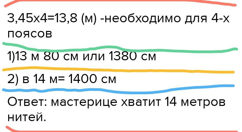 2.)345×4=1420(см)или 4(м)20(см)-понадобится для 4 поясов.-(ответ)