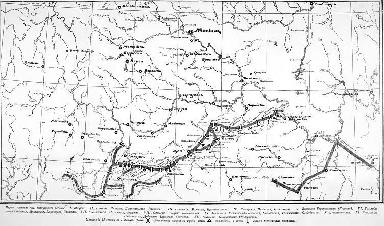 На схеме изображена система инженерных оборонительных сооружений, защищавших подходы к Москве и другим крупным городам в XVI-XVII вв.