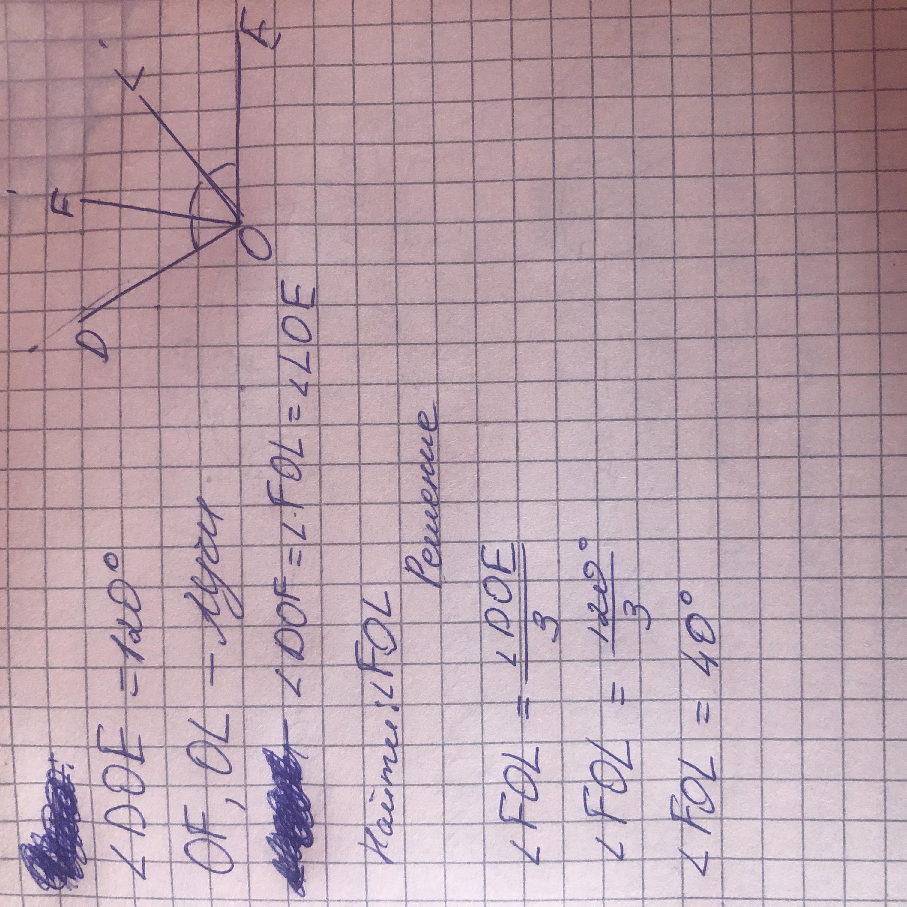 постройте угол DOE с градусной мерой 120°.Лучами OF и OL разделите его на 3 равных угла. Определите градусную меру угла FOL я не могу понять как это делается помогите.
