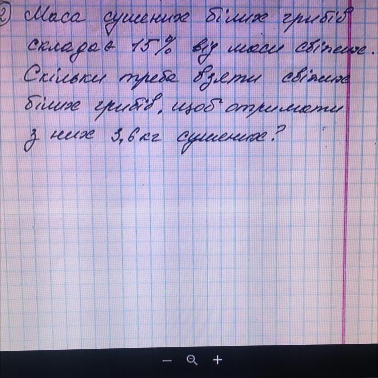 маса сушених білих грибів складає 15% від маси свіжих.Скільки треба взяти свіжих білих грибів, щоб отримати з них 3,6кг сушених