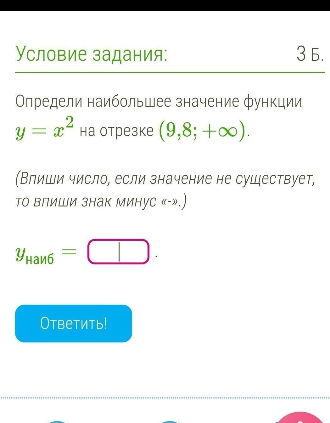 Наибольшего значения не существует, т. к. функция y=x² на закрытом луче [0;+∞) возрастает.
