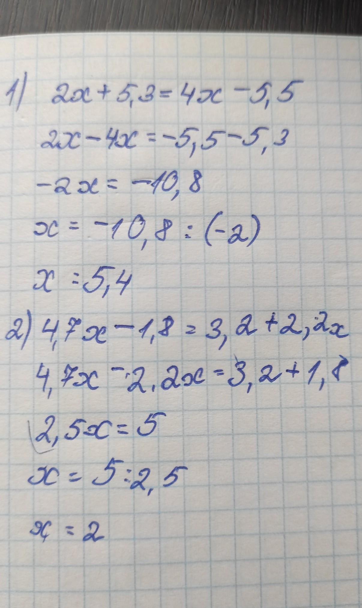 1) 5,3+5,5 = 4х-2х; 2х = 10,8; х = 10,8:2 = 5,4 2) 4,7х-2,2х = 3,2+1,8; 2,5х = 5; х = 5:2,5 = 2