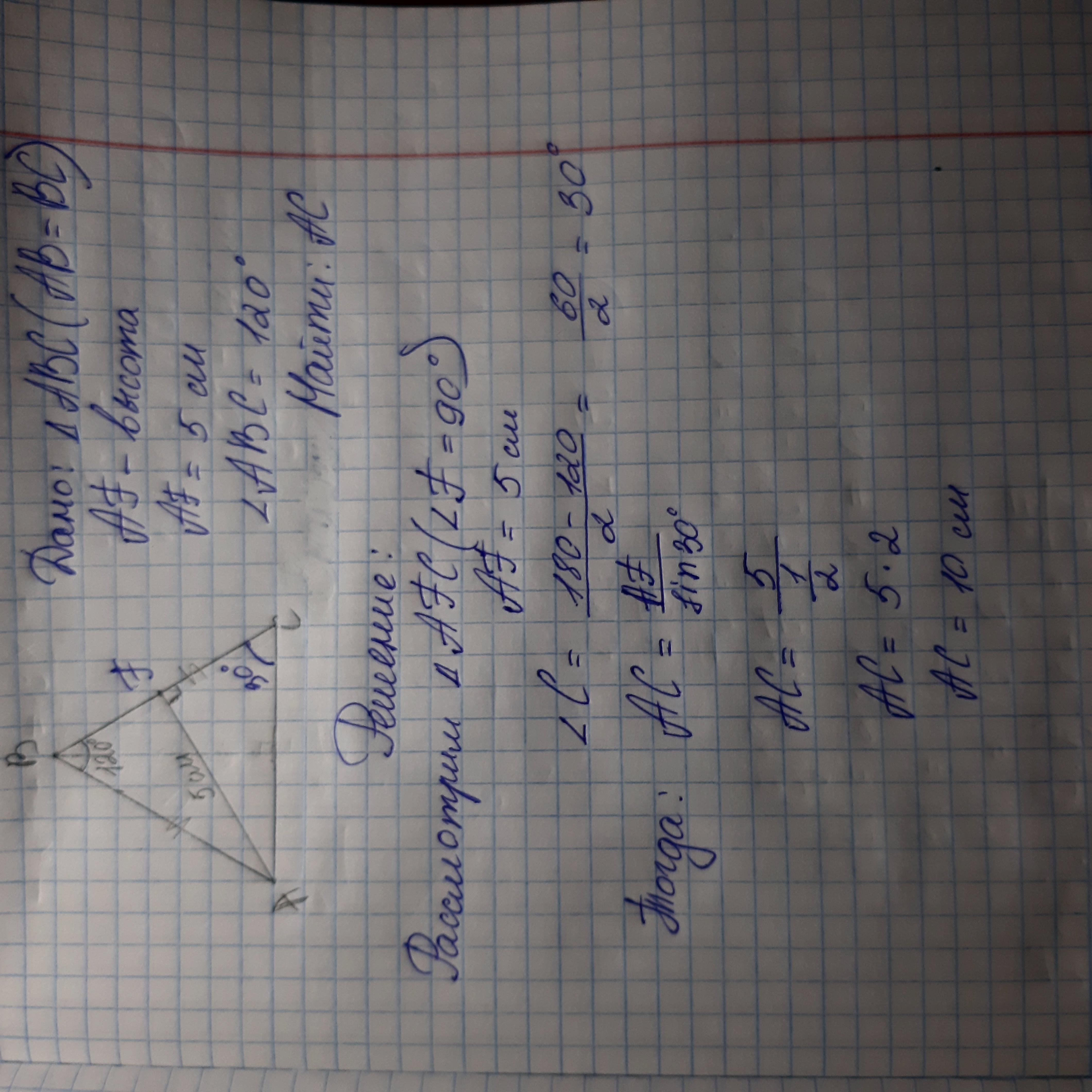 В равнобедренном треугольнике ABC с основанием AC угол B равен 120°. Высота треугольника, проведённая из вершины A, равна 5.