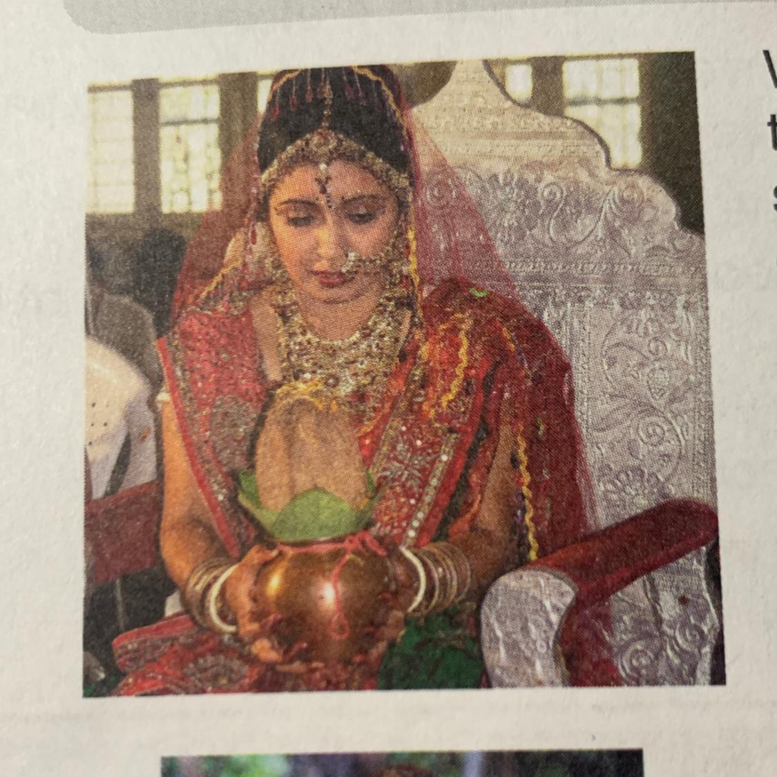 This picture shows a girl of one of the religions. She's all in red. In her hands is a ball-shaped thing. She sits on a chair that looks like a throne. This girl is covered in jewelry. ( Перевод:На этой картине изображена девушка одной из религий. Она вся в красном. В руках у неё шарообразная вещь. Сидит она на стуле похожего на трон. Эта девушка вся в украшениях.) надеюсь помогла