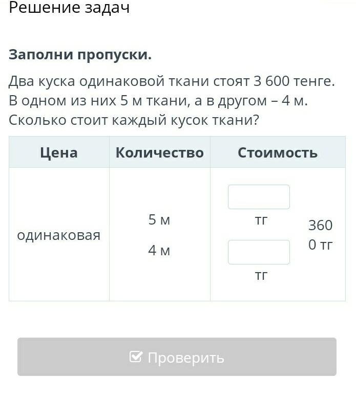 3 600тг÷(5 м+4 м)=400тг – (1 м ткани)