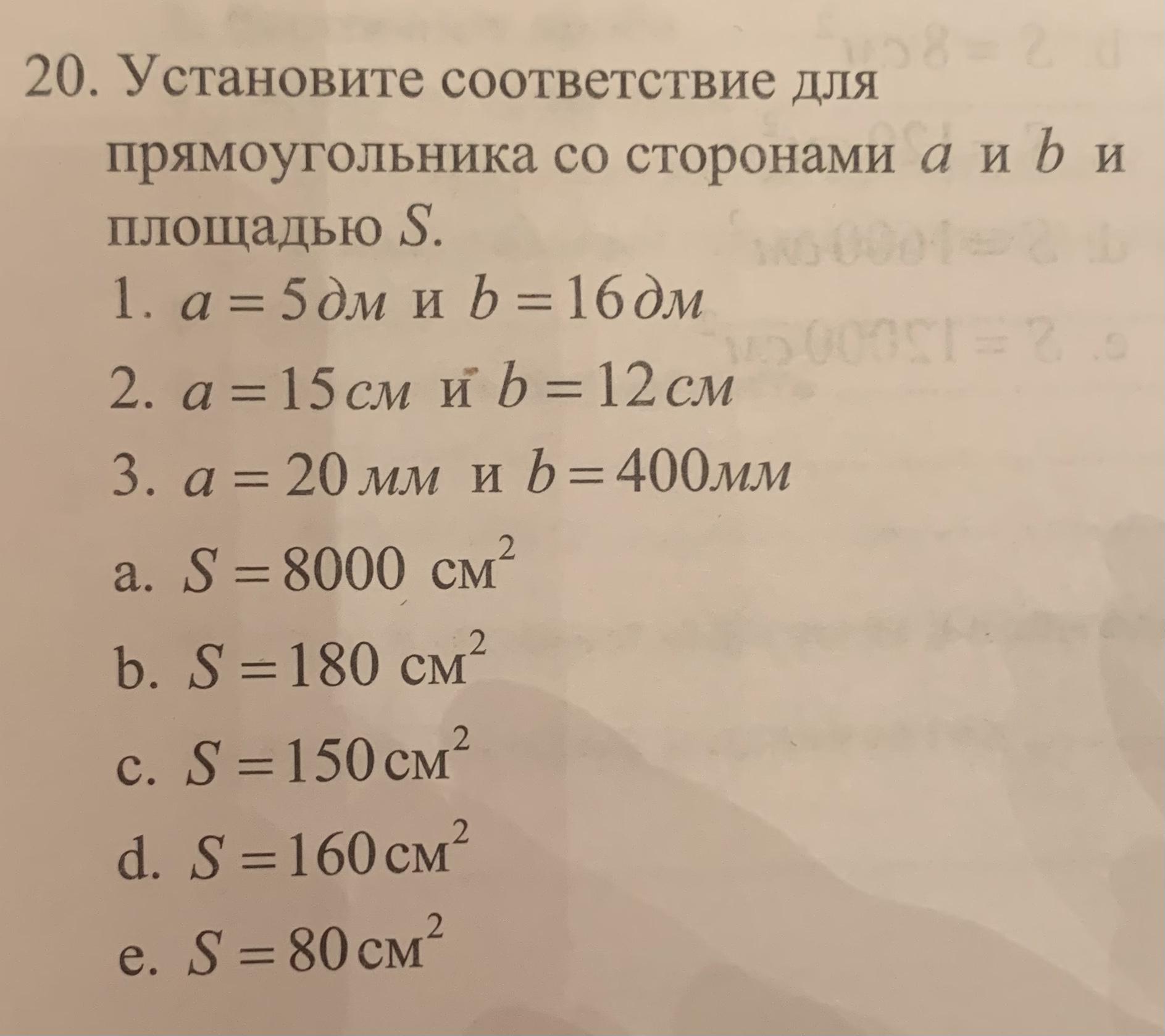 установите соответствие для прямоугольника со сторонами a и b и площадью S .