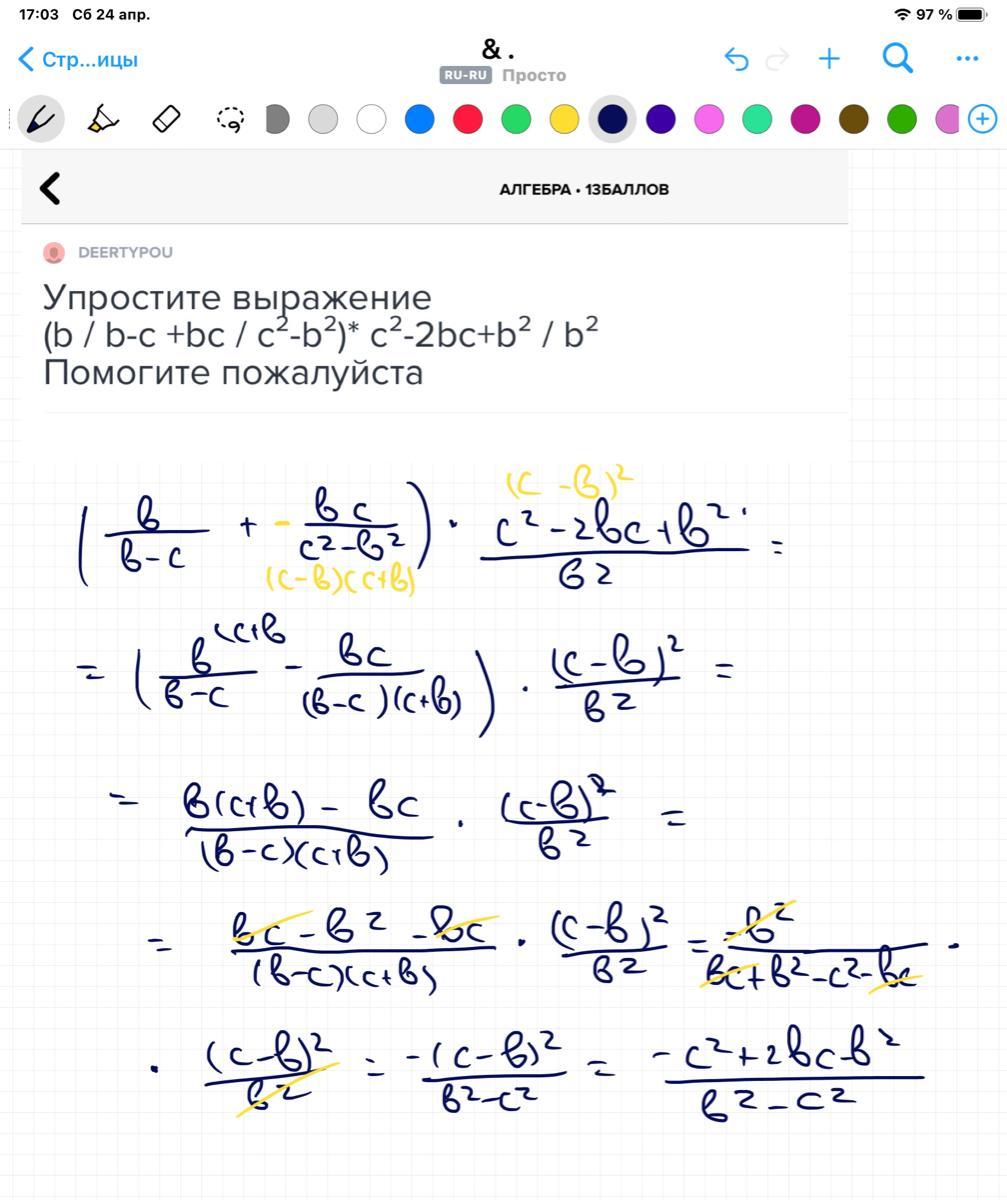 (b / b-c +bc / c²-b²)* c²-2bc+b² / b²