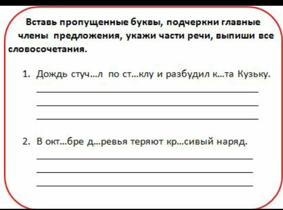1) Дождь (сущ.) стучал (глагол) по (предлог) стеклу (сущ.) и (союз) разбудил (глагол) кота (сущ.) Кузьку (сущ.) = (главные члены - дождь стучал разбудил)