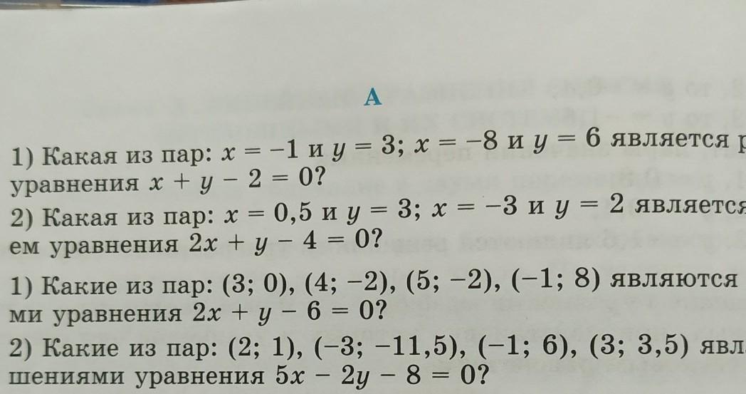1366. 1) Какая из пар: x = - 1 и y = 3 ; x = - 8uy = 6 является решением уравнения x + y - 2 = 0 ? 2) Какая из пар: x = 0, 5ny = 3 ; x = - 3 и y = 2 является решени ем уравнения 2x + y - 4 = 0 ?