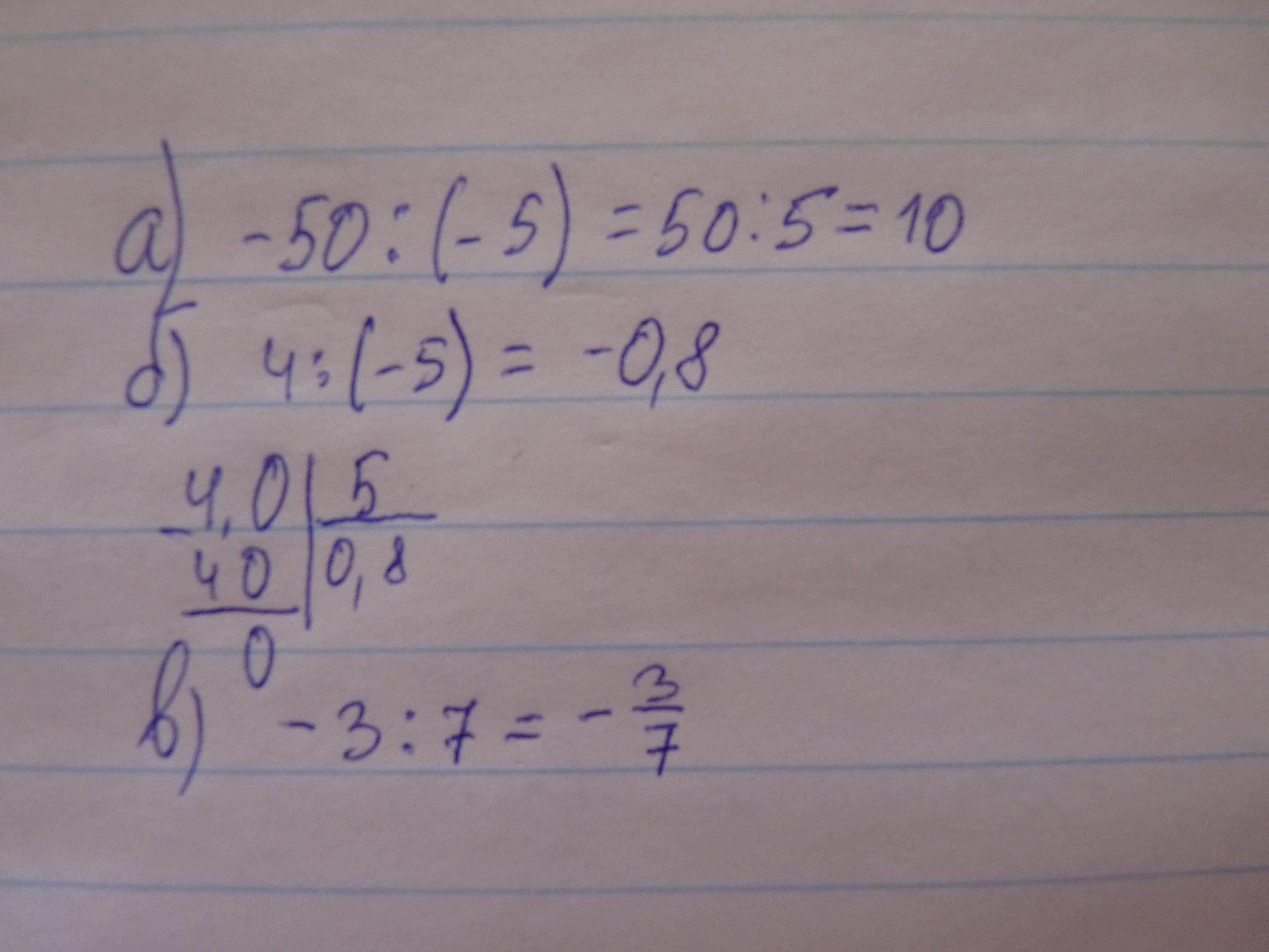 Выполните действие: а) -50:(-5);. б) 4:(-5); в) -3:7;. г) 2,4:(-6);. д) -36:1,8;. е) -2/3: 1 1/3; ж) -5/6: 5/6;. з) -1 1/6:(-3 1/2).