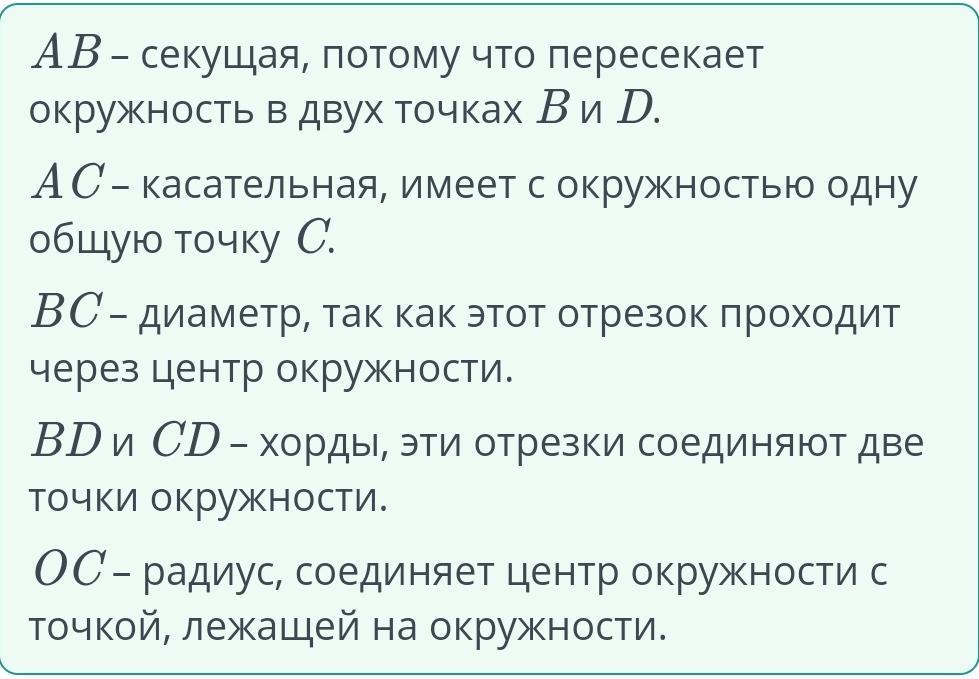 АС-касательная,т.к. касается окружности,имея с ней одну общую точку . ВС-диаметр,т.к. этот отрезок проходит через центр окружности.