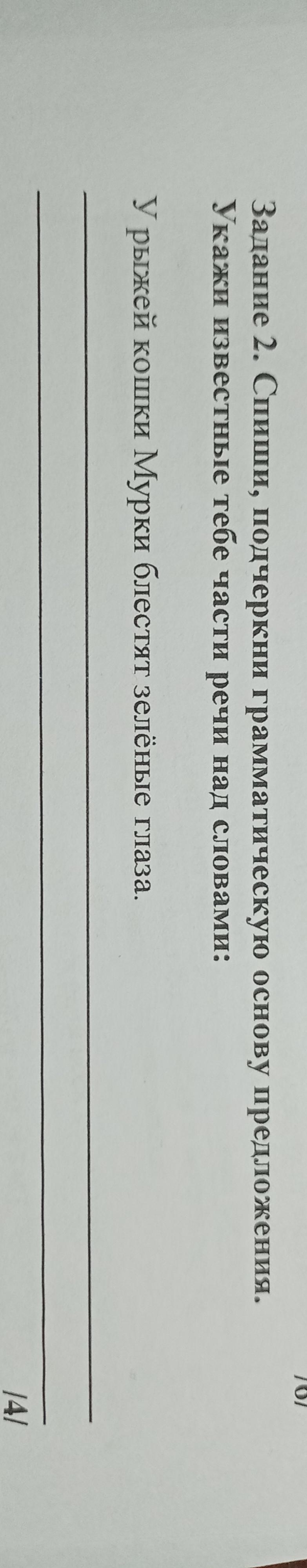 Спиши,подчеркни граматическую основу предложения.Укажи известные тебе части речи гад словами: У рыжей кошки Мурки блестят зелёные глаза.