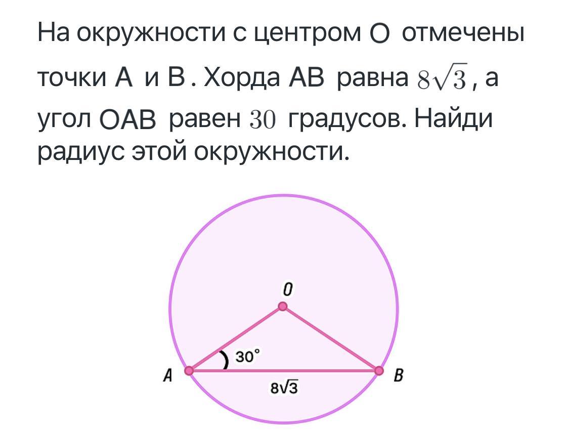 На окружности с центром О отмечены точки А и В. Хорда АВ равна 8 корень 3, а угол ОАВ равен 30 градусов. Найди радиус этой окружности.