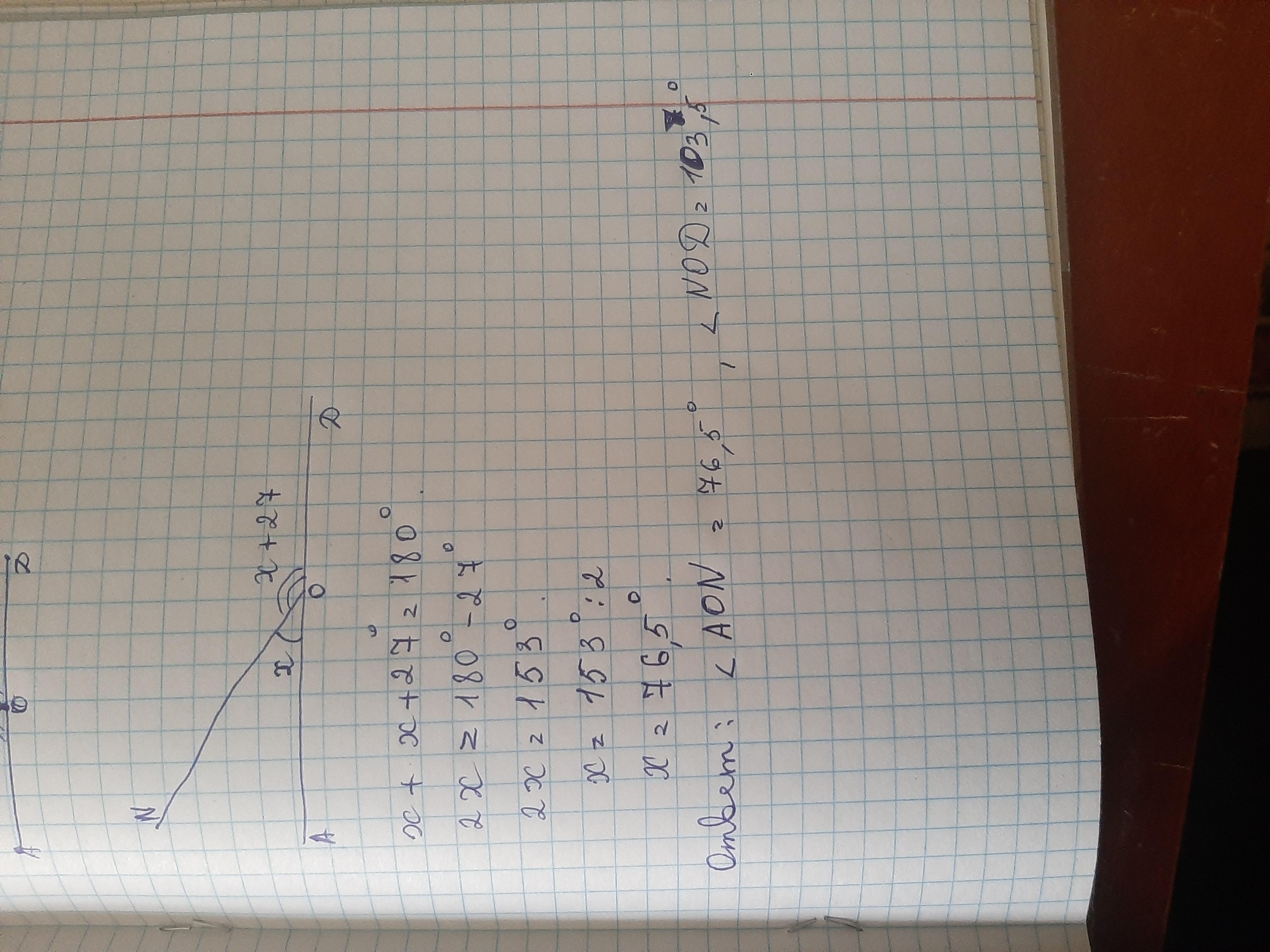 надо найти угол Х. АОD развернутый, найдите угол Х если угол AON меньше на 27 градусов меньше чем Х