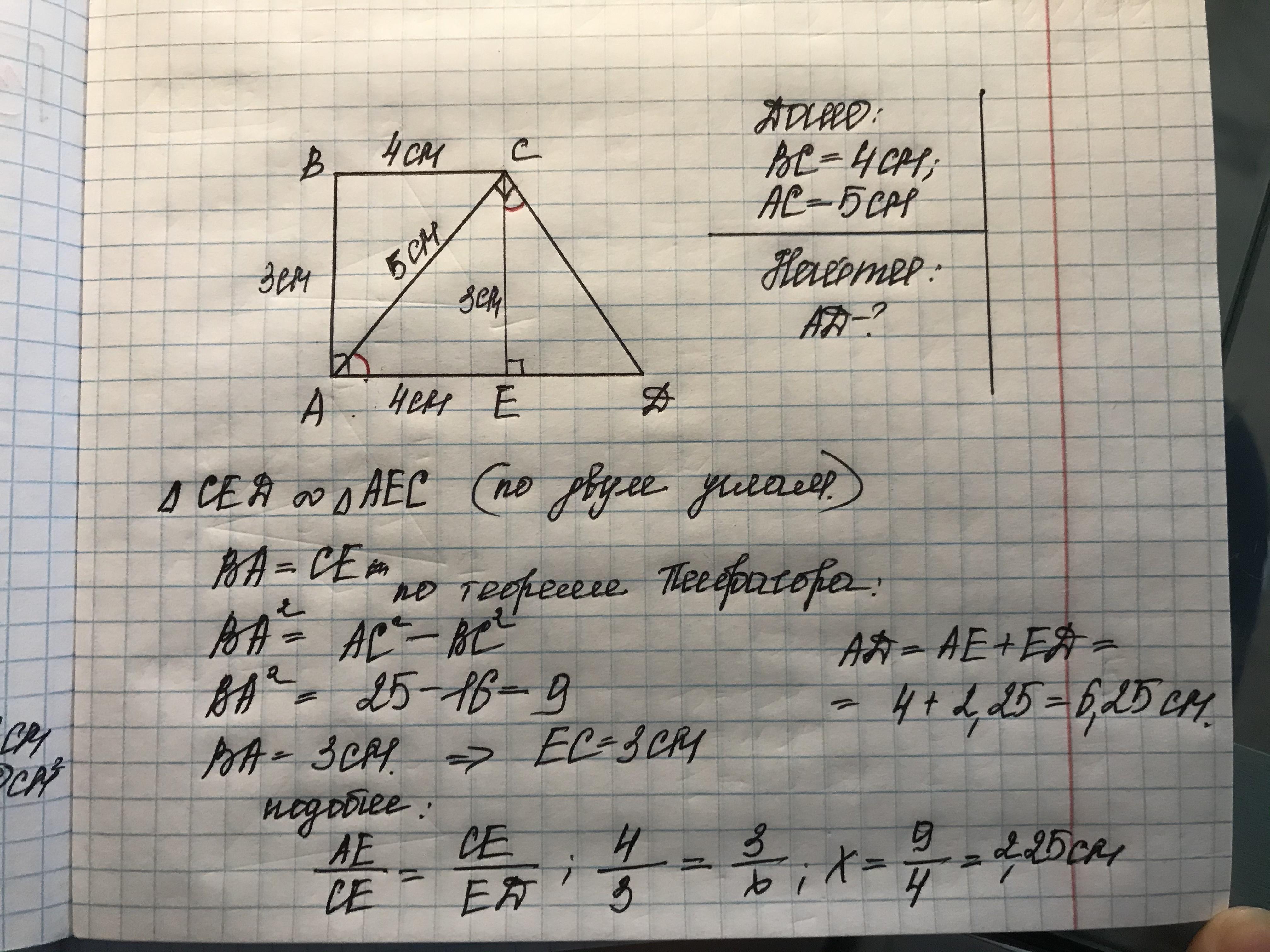 У прямокутній трапеції менша діагональ дорівнює 5 і є перпендикулярною до більшої бічної сторони. Менша основа трапеції дорівнює 4. Обчисліть довжину більшої основи трапеції