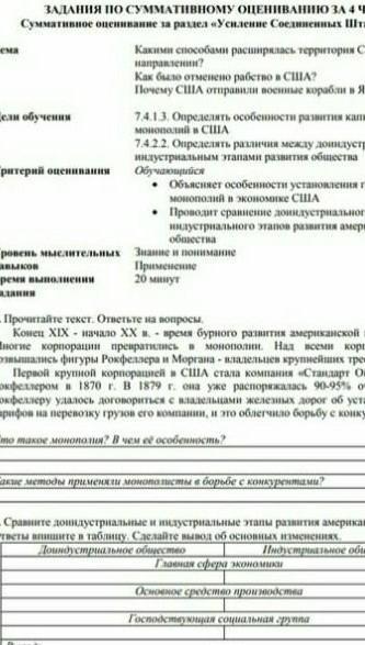 ЗАДАНИЯ ПО СУММАТИВНОМУ ОЦЕНИВАНниЮ ЗА 4 ЧЕТВЕРТЬ Суммативное оценивание за раздел «Усиленне Сосдиненных Штатов Америки» Какими способами расширилась территория США в западном направлении? Как было отмененно рабство в США? Почему США отпранили воснные корабли в Янонню? Тема Цели обучении 7413. Определять особенности развития капиталистических 7.422 Определять различия между доиндустрнальным и индустриальным этапами развития общества Обучающийся . Объясияет особенности установления господства Критерий оненивання монополий в экономике США . Проводит сравнение доиндустрнального и индустриального этапов развития американского обшества Уровень мыелительных Знание и понимание Применение 20 минут Времи вынолнении 1. Прочитайте текет. Ответьте на вопросы, Конец XIX начало XX в.-премя бурного развития американской промышленности. Многие корпорации препратились в монополии. Нал всеми корпорашиями США возвышались фигуры Рокфеллера и Моргана- владельшев крупнейших трестов в стране. Первой крупной корпорацией США стала компания «Стандарт Ойл», созданная Д. Рокфеллером в 1870г. В 1879 г. она уже распорижалась 90-95% очищенной нефти. Рокфедлеру удалось договориться с владельцами железных дорог об установлении низких тарифов на перевозку грузов его компании, и это облегчило борьбу с конкурентами. Что такое монополия) В чем её окобенность? Какие методы применкги монопатисты в борьбе с конкурснтами? 2. Сравните доиндустриальные и индустриальные этапы развития американского общества Ответы впишите в таблицу, Слелайте вывод об основных изменениях, Доиндустриальное общество Пндустриальное общество Главная среа кономики Основное средство производства Господствующая социальная зруппа (7 класс это по всемирной истории)
