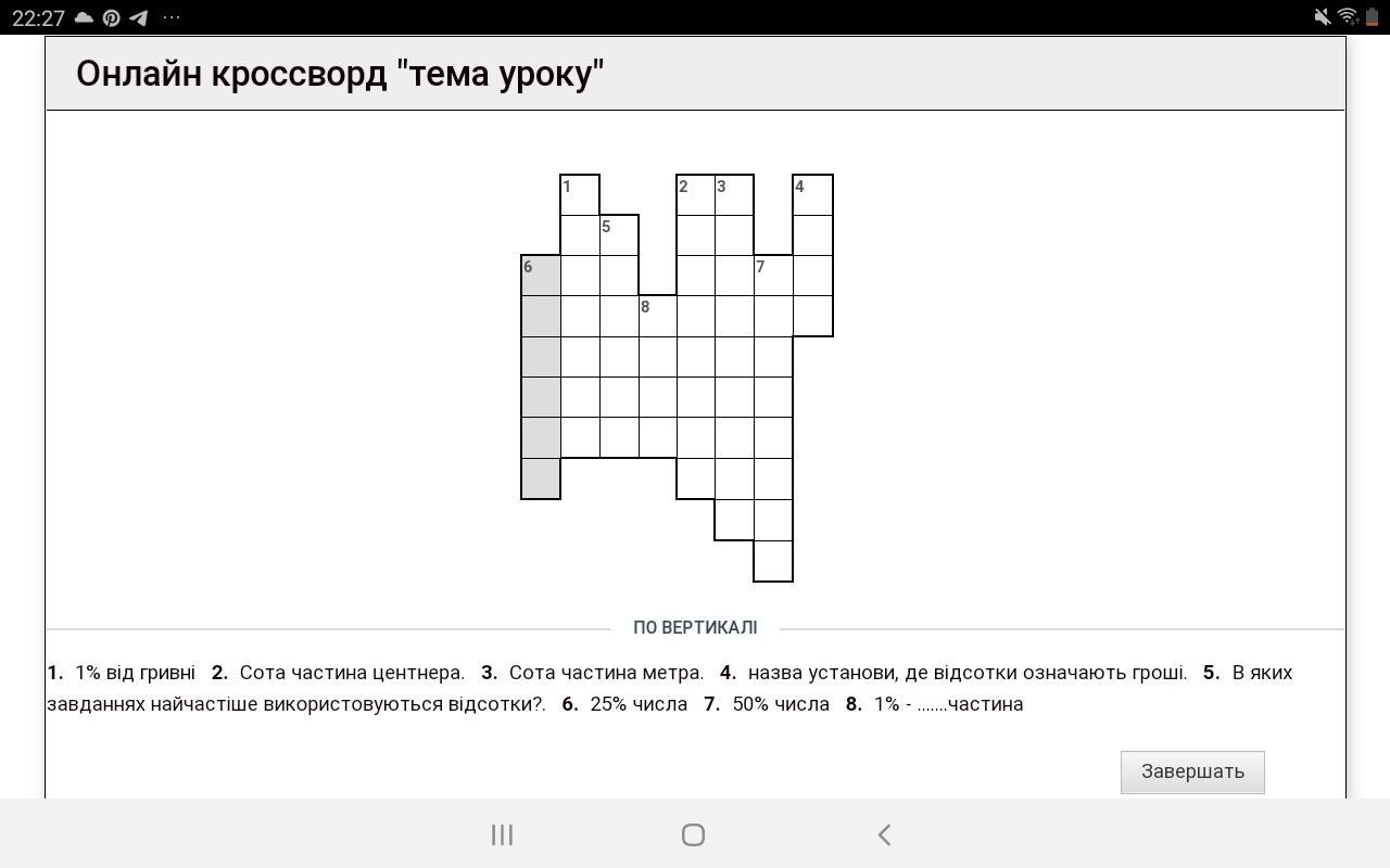 1. Копійка; 2. Кілограм; 3. Сантиметр; 4. Банк; 5. Задача; 6. Чверть; 7. Половина; 8. Сота