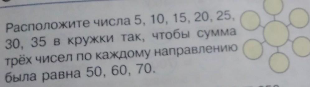 Расположите числа 5,10,15,20,25,30,35 в кружки так, чтобы сумма трёх чисел по каждому направлению была равна 50,60,70.