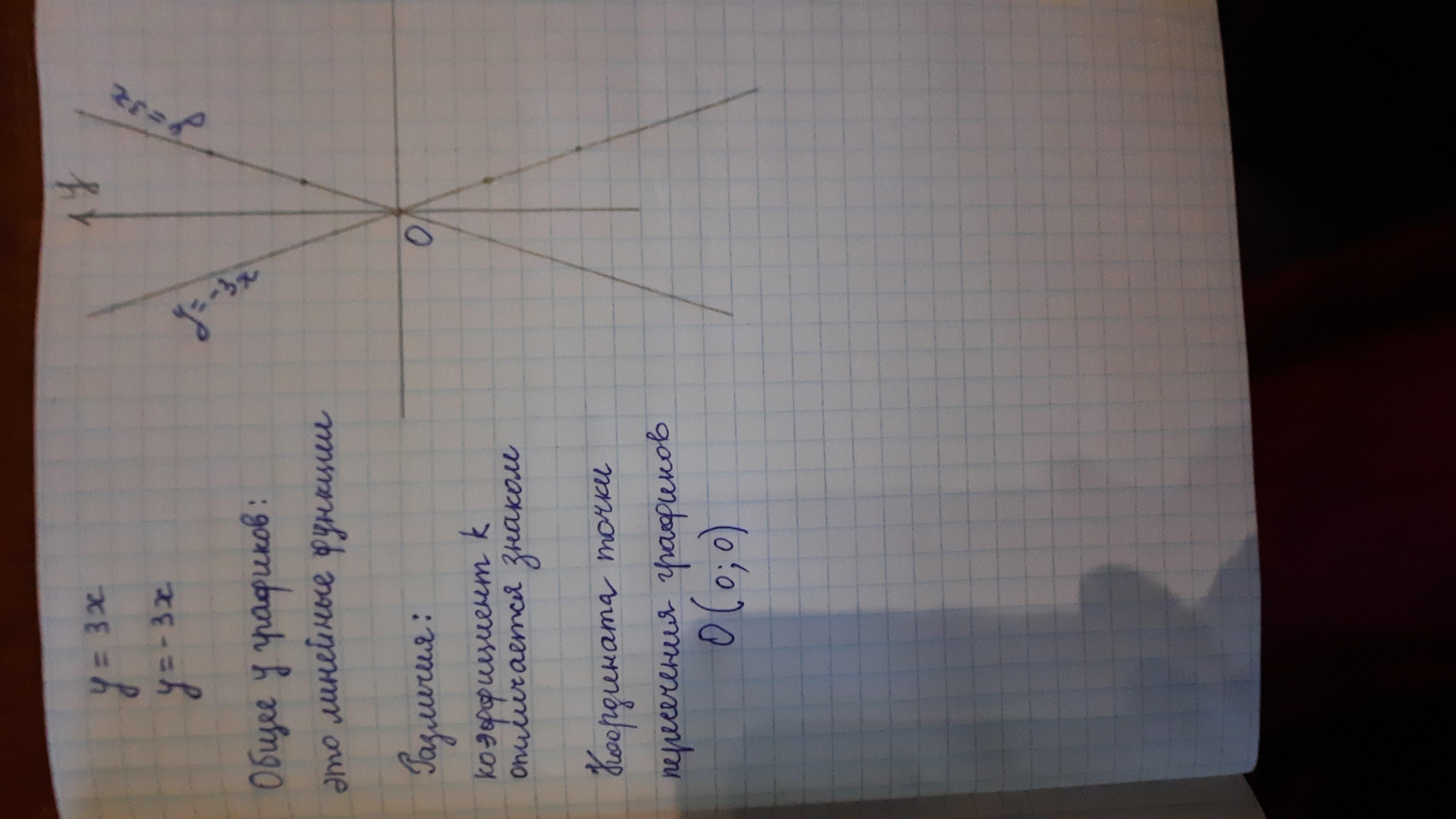 ПОЖАЛУЙСТА СРОЧНО!!что общего у данных графиков?,в чём различия данных графиков?,чему равны координаты точки пересечения данных прямых?,у=-3х,у=3х