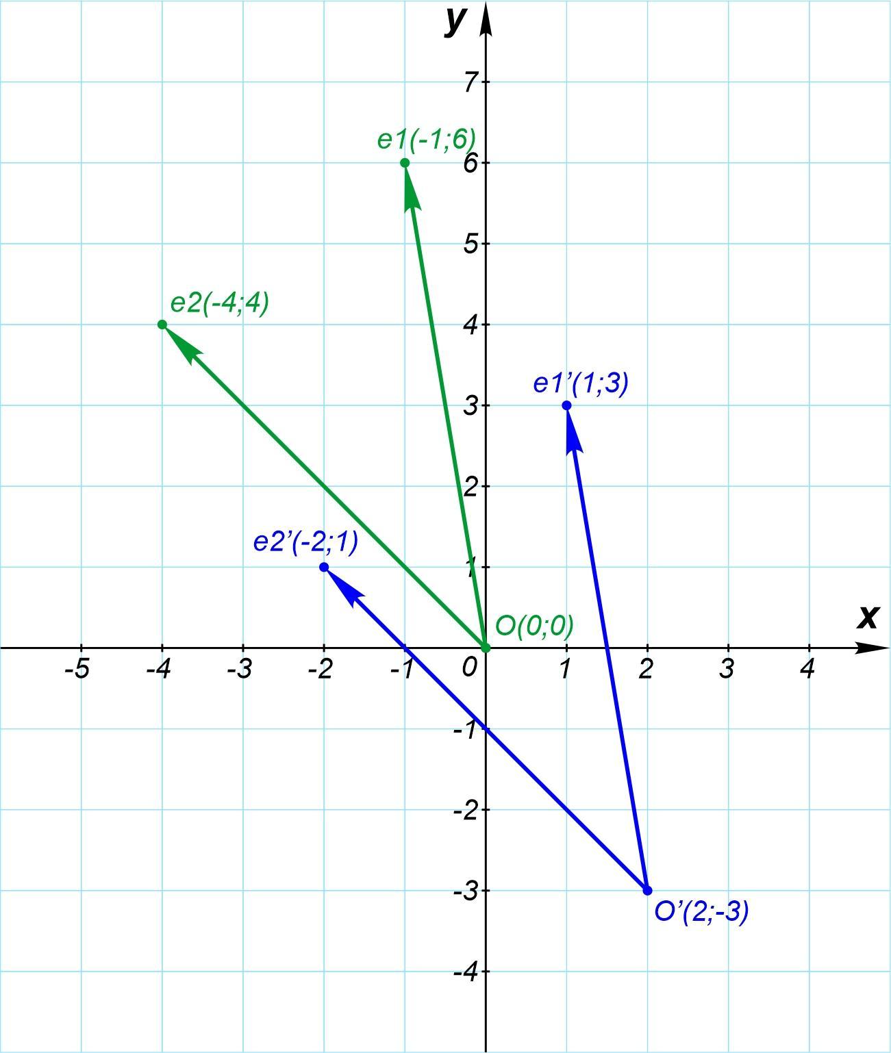 всистемах(O, e1,e2)и(O′,e1′,e2′),где O′(2,−3),e1′(1,3), e2′(−2,1).