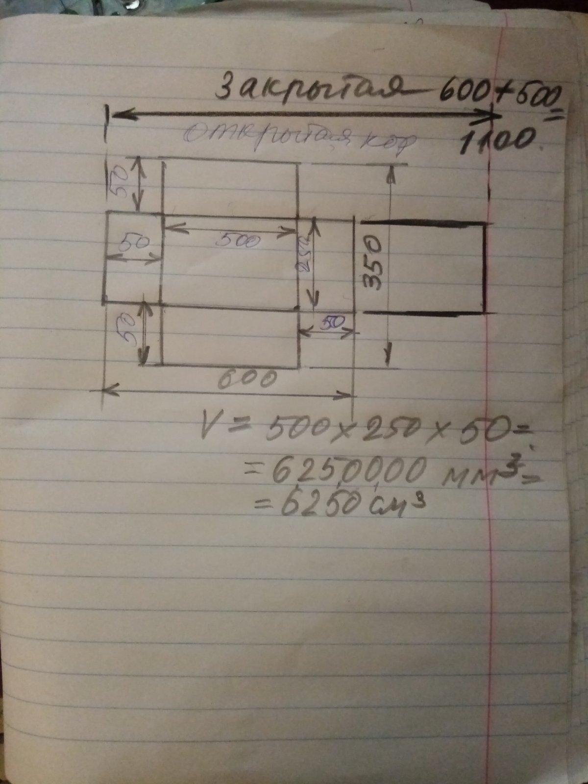 Обьем коробки V=500x250x50=62500000(мм^3)