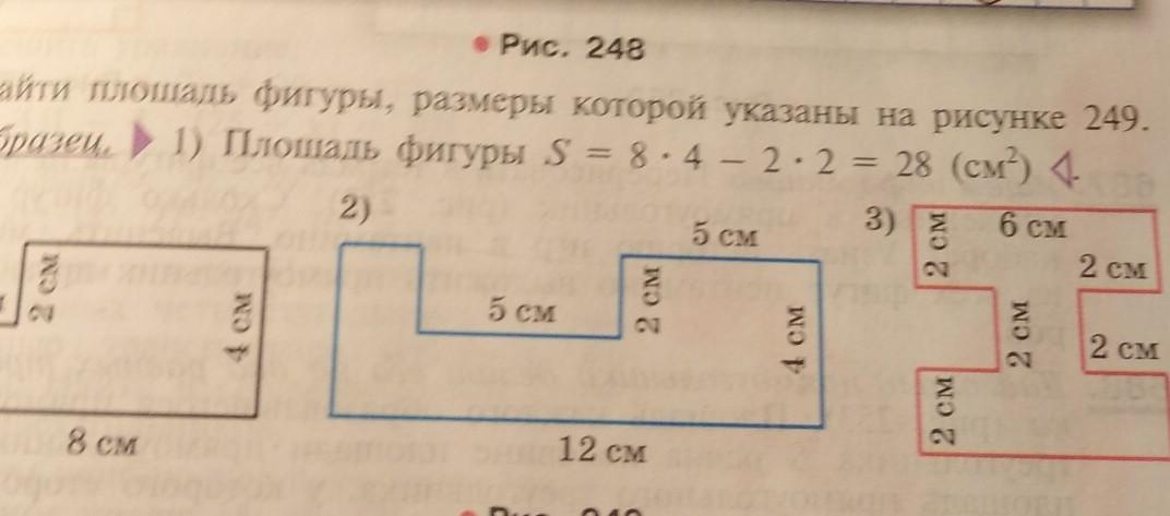 в) Площадь фигуры равна площади большого прямоугольника размером 6 см×(2+2+2) см, то есть квадрата 6 см×6 см, из которой вычтена площадь двух "вырезанных" квадратов размером 2 см×2 см