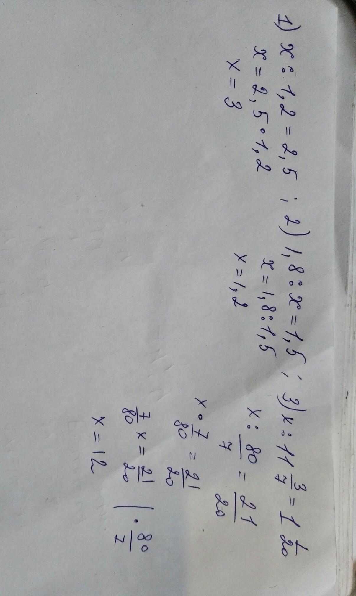 Найдите нейзвестный член отнашения: 1)х:1,2=2,5; 2)1,8:х=1,5; 3)х:11 3/7=1 1/20.