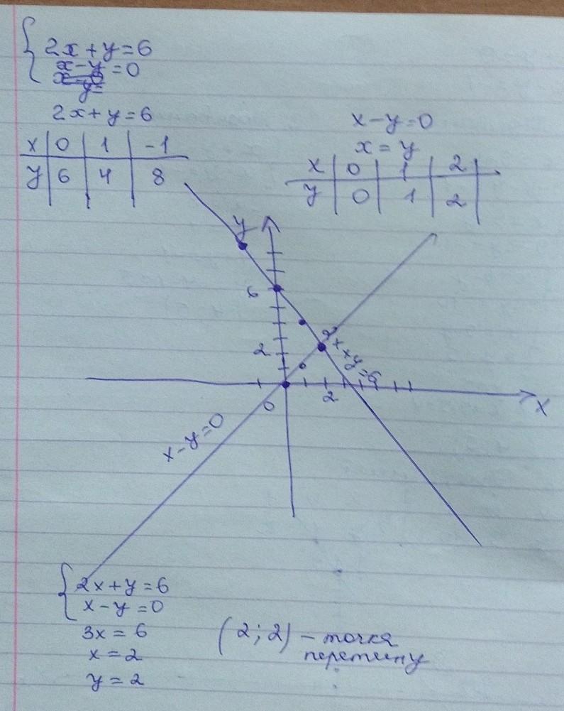 розв'язати графічно систему рівнянь 2x+y=6 x-y=0