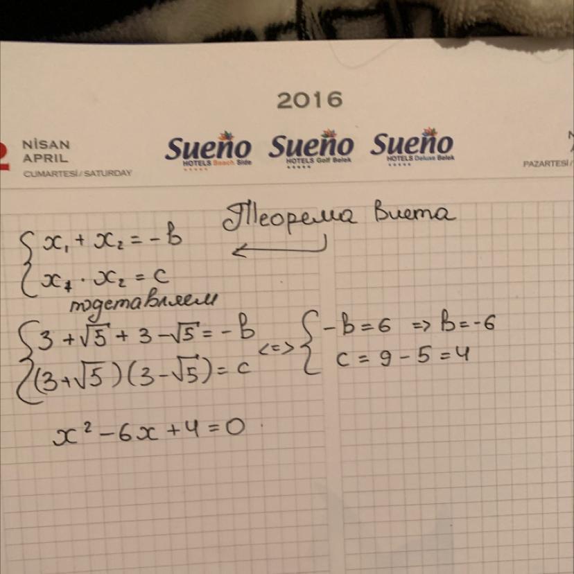 Используя теорему Виетта, составьте квадратное уравнение по его корням 3+√5 и 3-√5