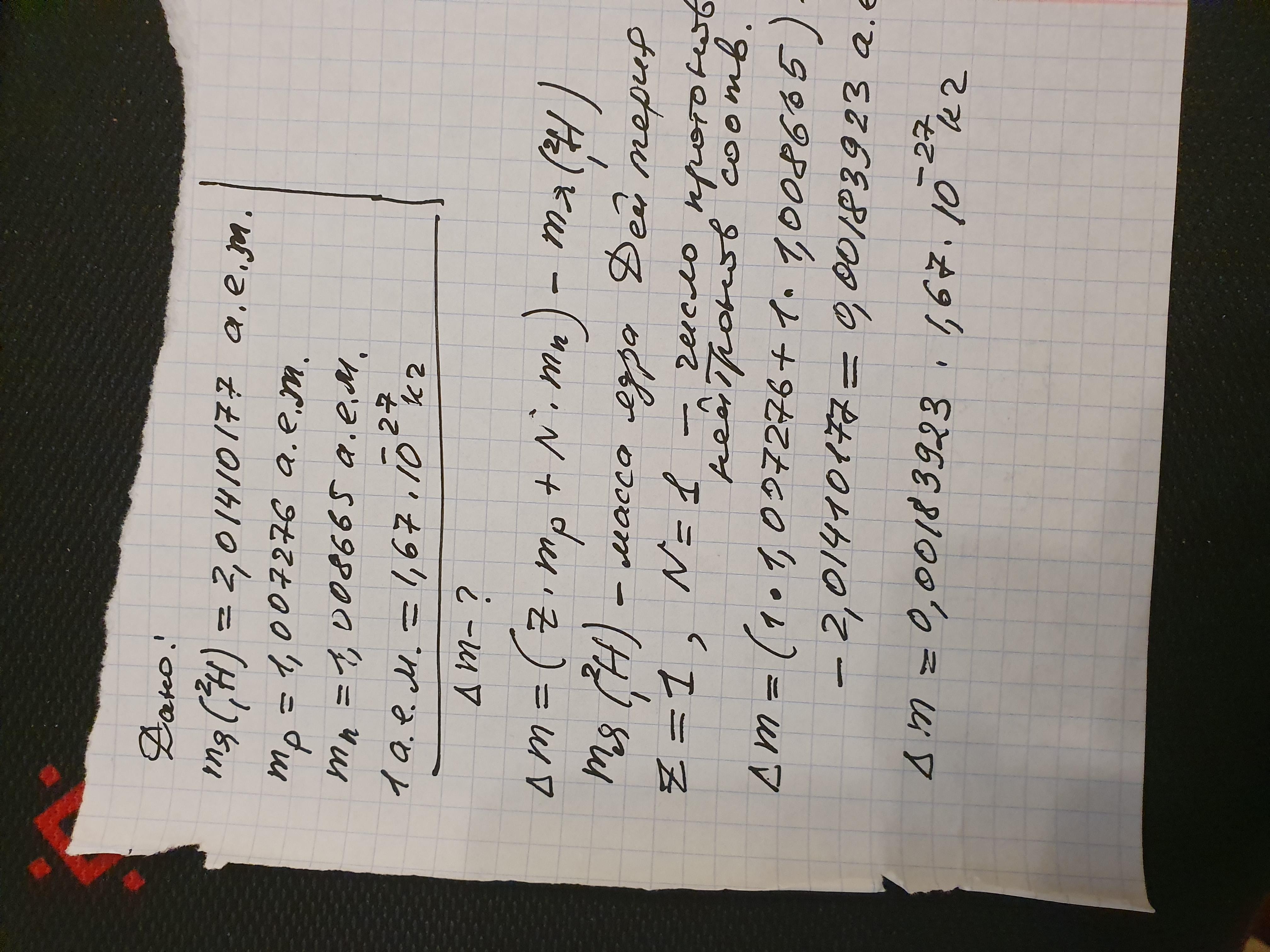 Ядро тяжелого дейтерия Н (тяжелого водорода). Масса протона 1,007276 а.е.м =1,67262* 10^-27 кг. Масса нейтрона 1,008665 а.е.м =1,67493*10^-27 кг. Определите дефект масс ядра